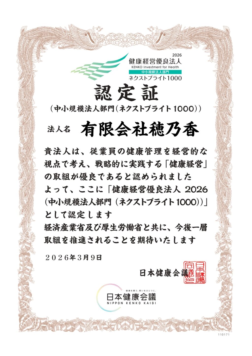 2026.04.07 お知らせ 「健康経営優良法人2026(ネクストブライト1000)」に認定されました この度、有限会社穂乃香は「健康経営優良法人2026」に認定されました。 今回の認定では、中小規模法人部門の認定企業の中から、特に優れた取り組みを行っている上位法人として「ネクストブライト1000」の称号も併せていただくことができました。 これからも「健やかに働ける職場」を目指し、戦略的な健康管理を継続してまいります。 一覧へ戻る 前へ